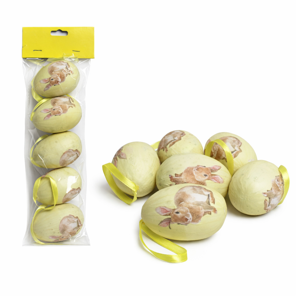 Dieses liebevoll gestaltete Set besteht aus 6 dekorativen Ostereiern aus Kunststoff, die mit einer edlen Papierhüllung umwickelt sind. Jedes Ei ist mit einem niedlichen Hasenmotiv verziert und mit einem gelben Band ausgestattet, sodass sie ganz einfach aufgehängt werden können.
