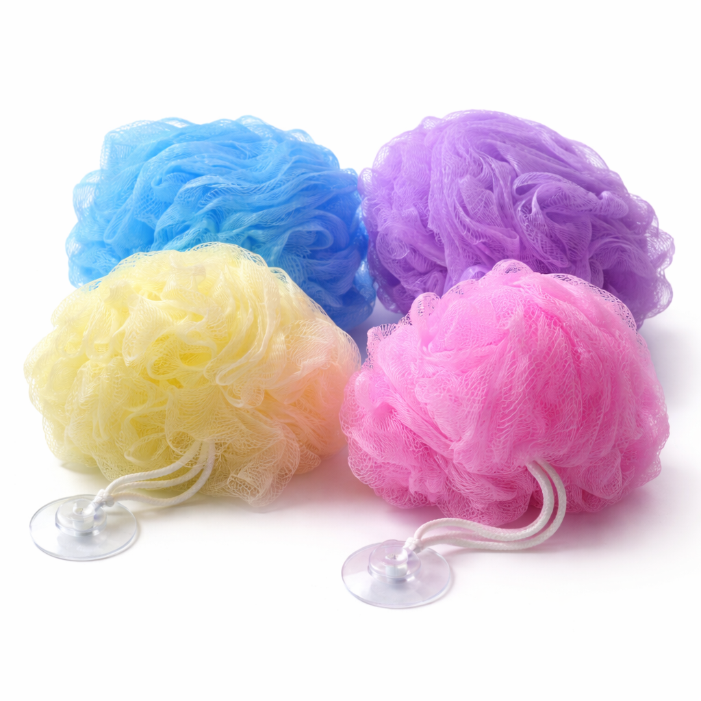 Badeschwamm Duschknäul XL – 4er Familien-Set Duschschwämme mit Saugnapf