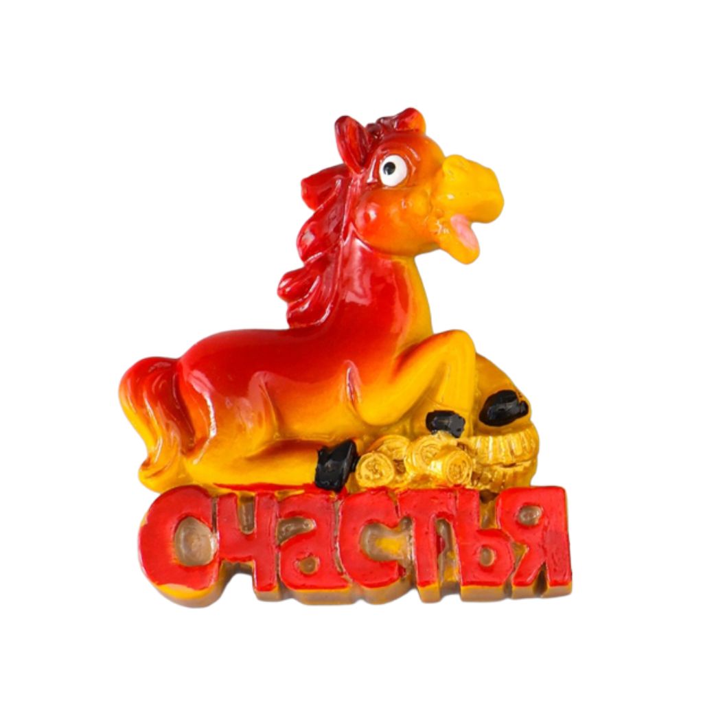 Diese Magnete sind farbenfrohe Pferdefiguren mit russischen Aufschriften.